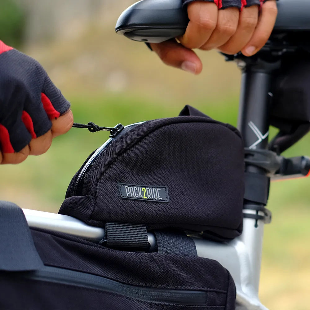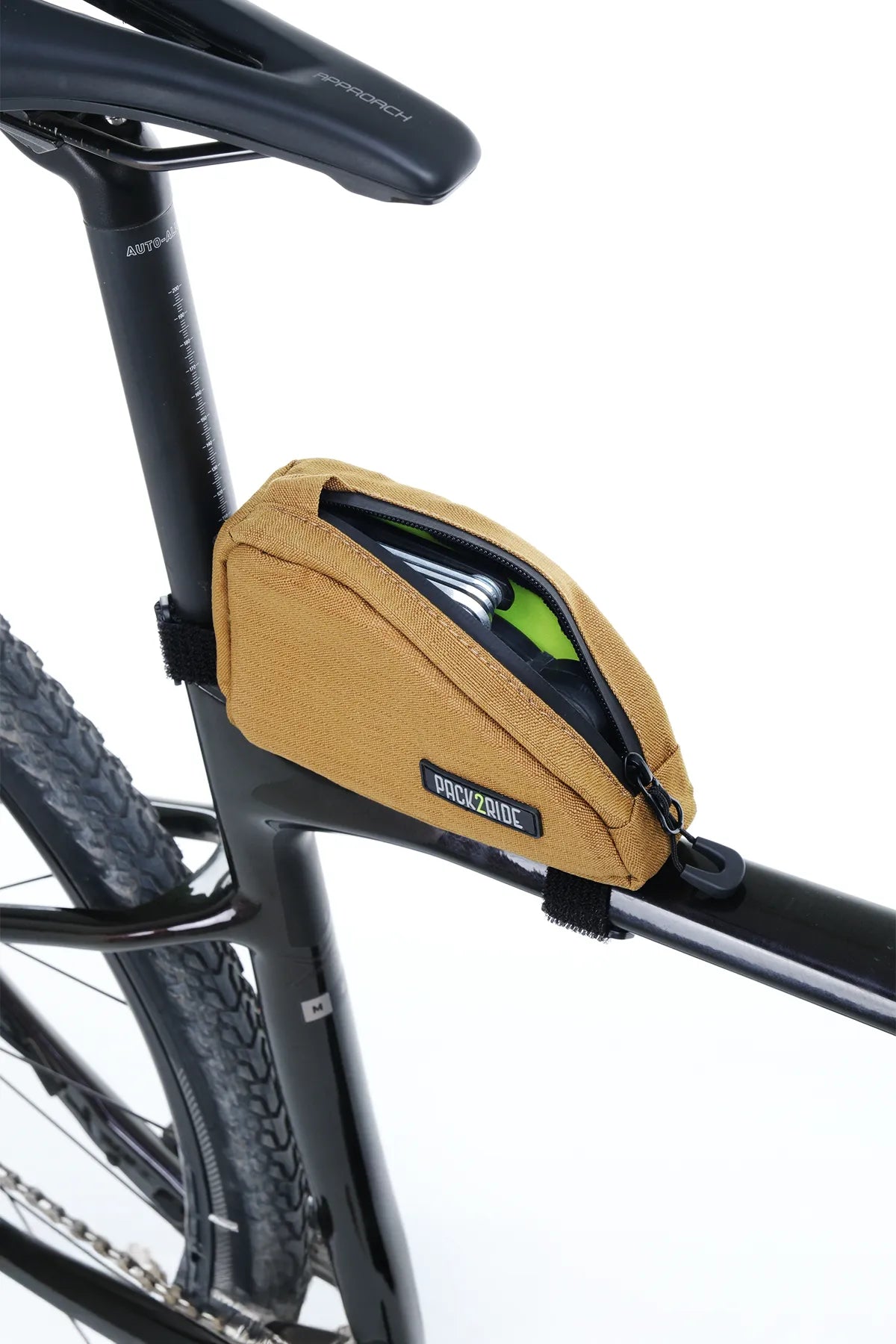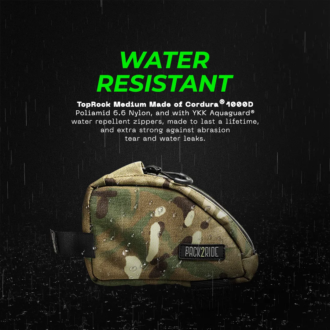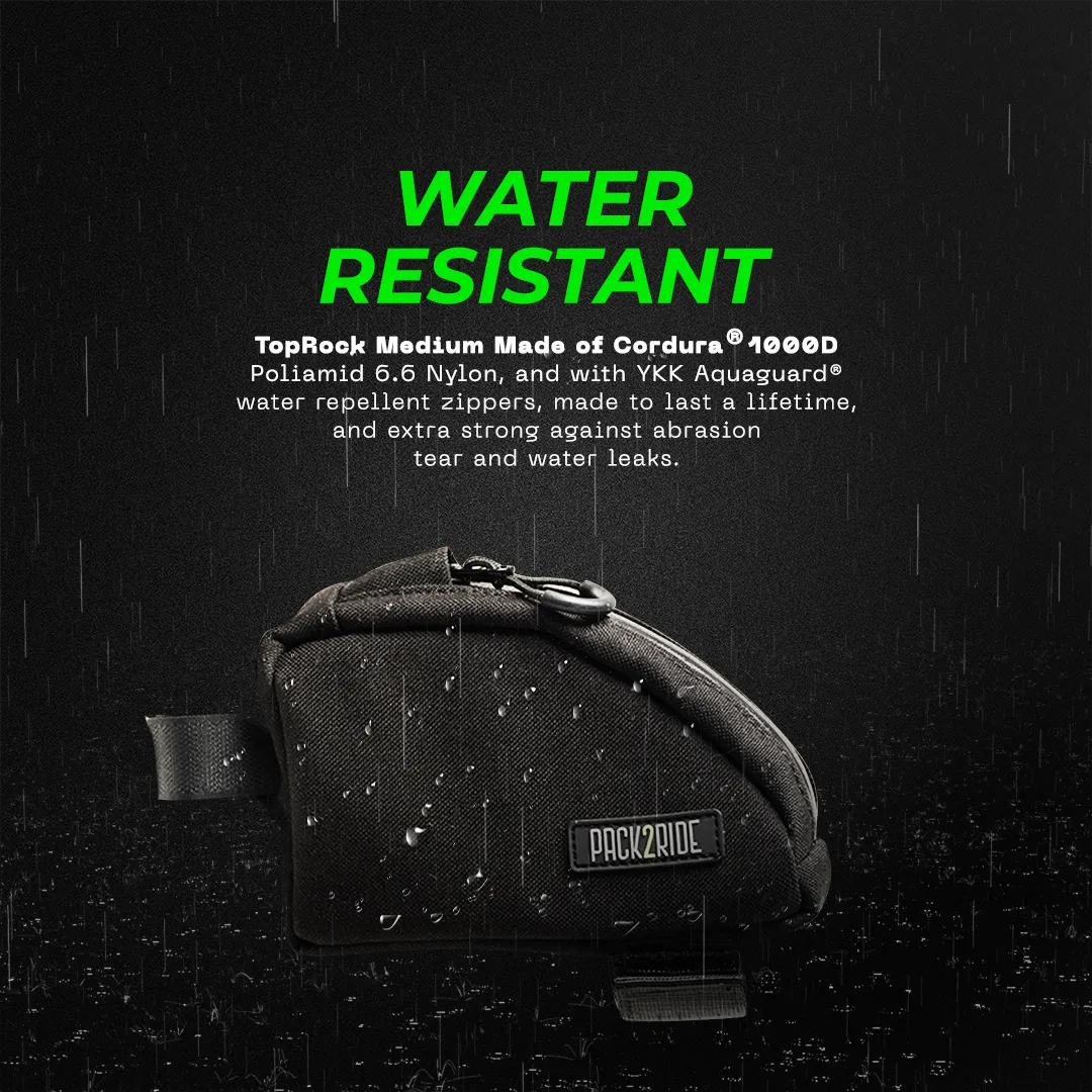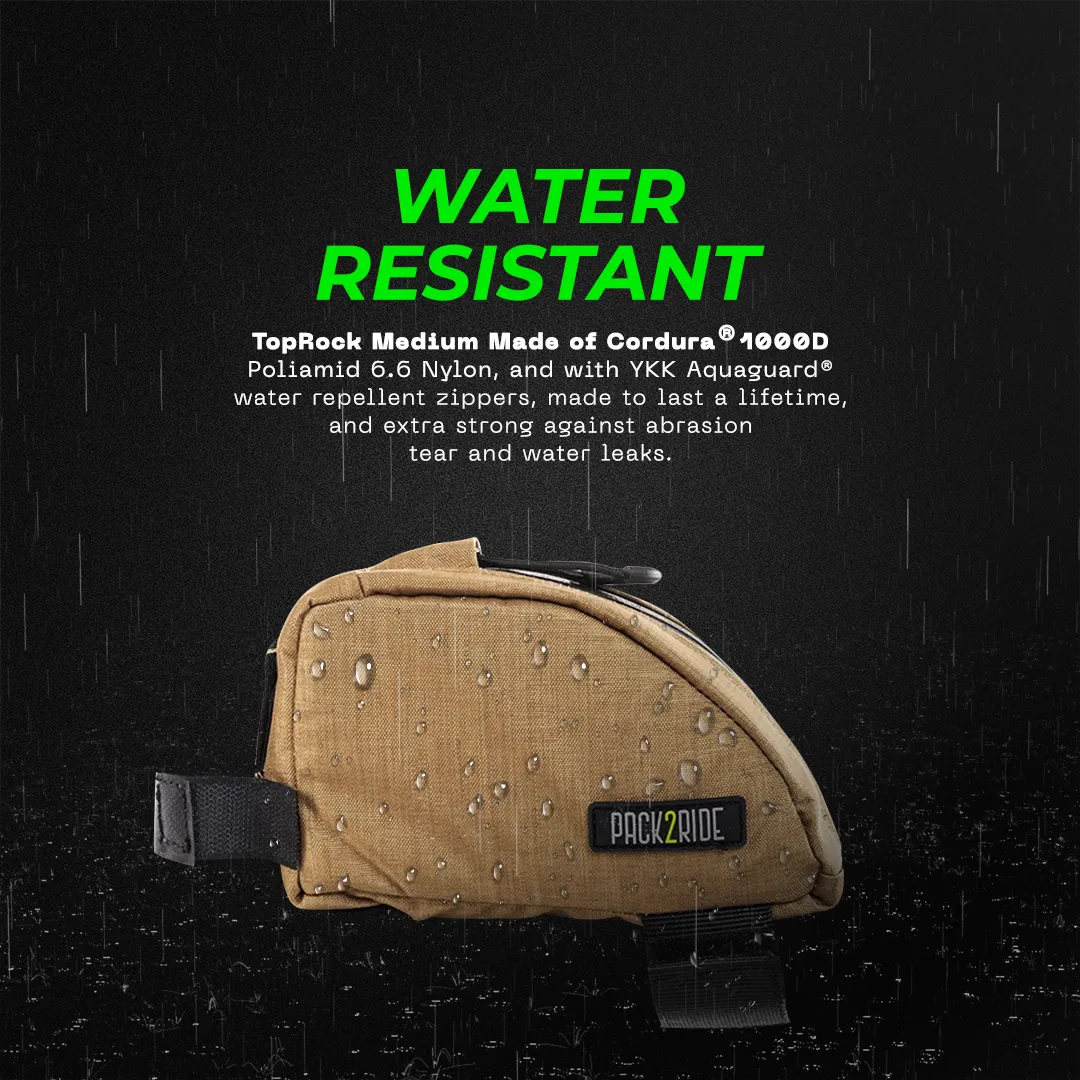 • Water Resistant. Produced with long-lasting YKK AquaGuard® zipper with water-repellent coating and Cordura® 1000D fabric which is resistant to water and harsh conditions. Enjoy your Pack2Ride frame bag for life.