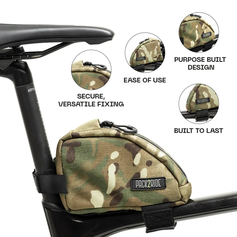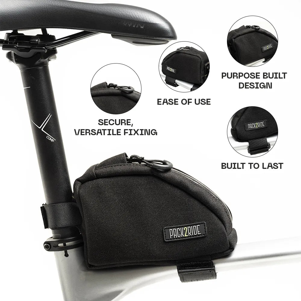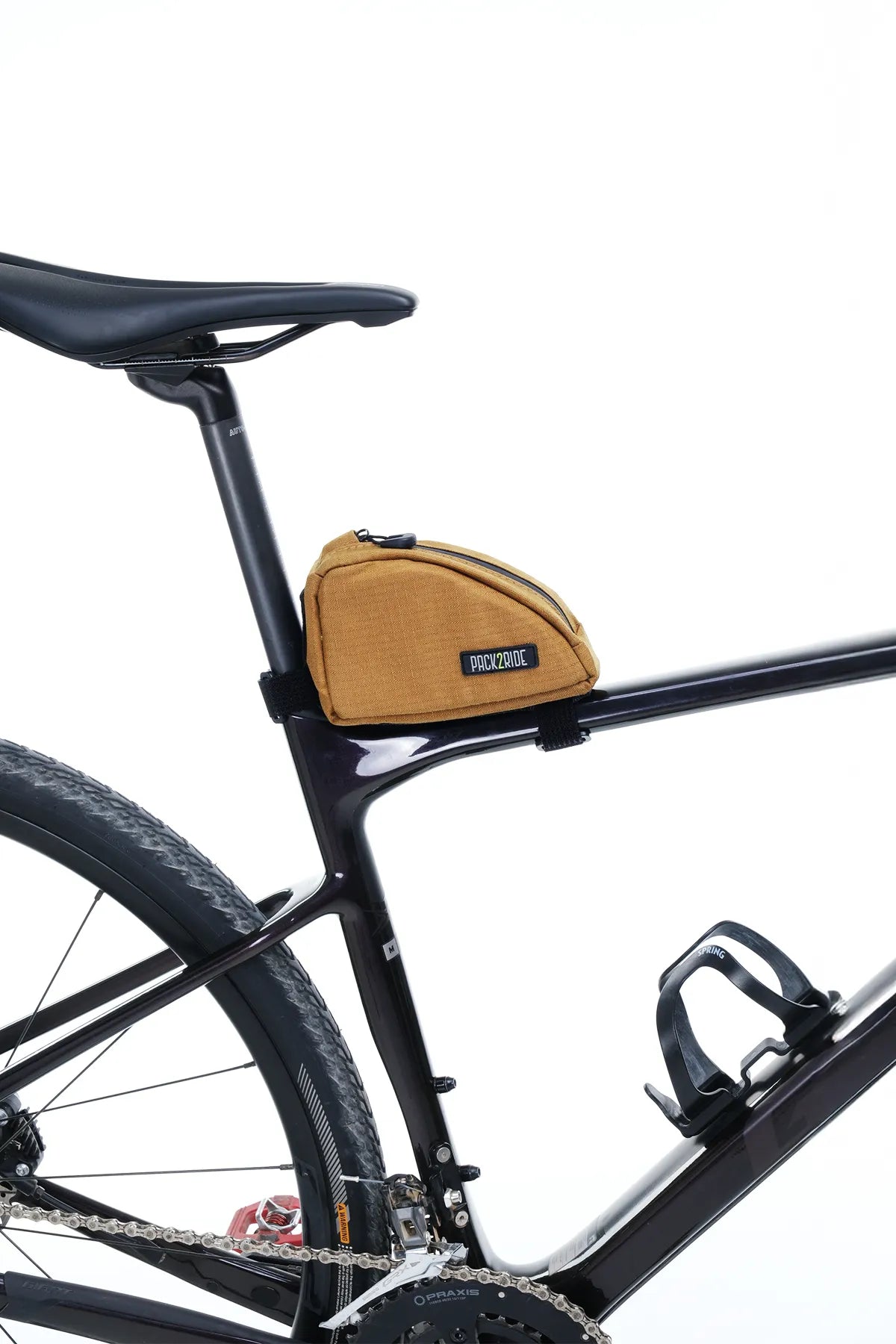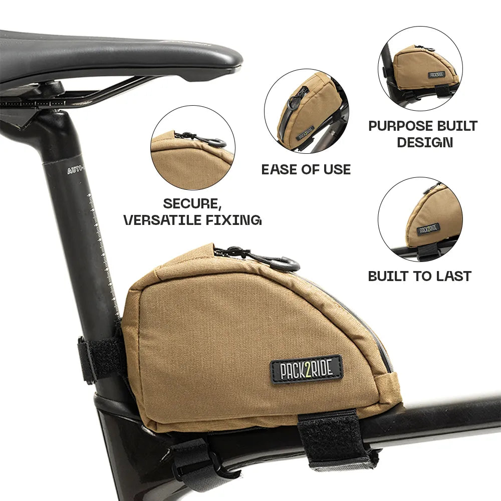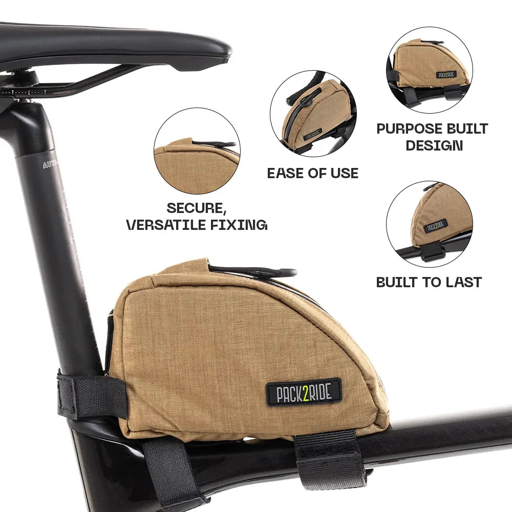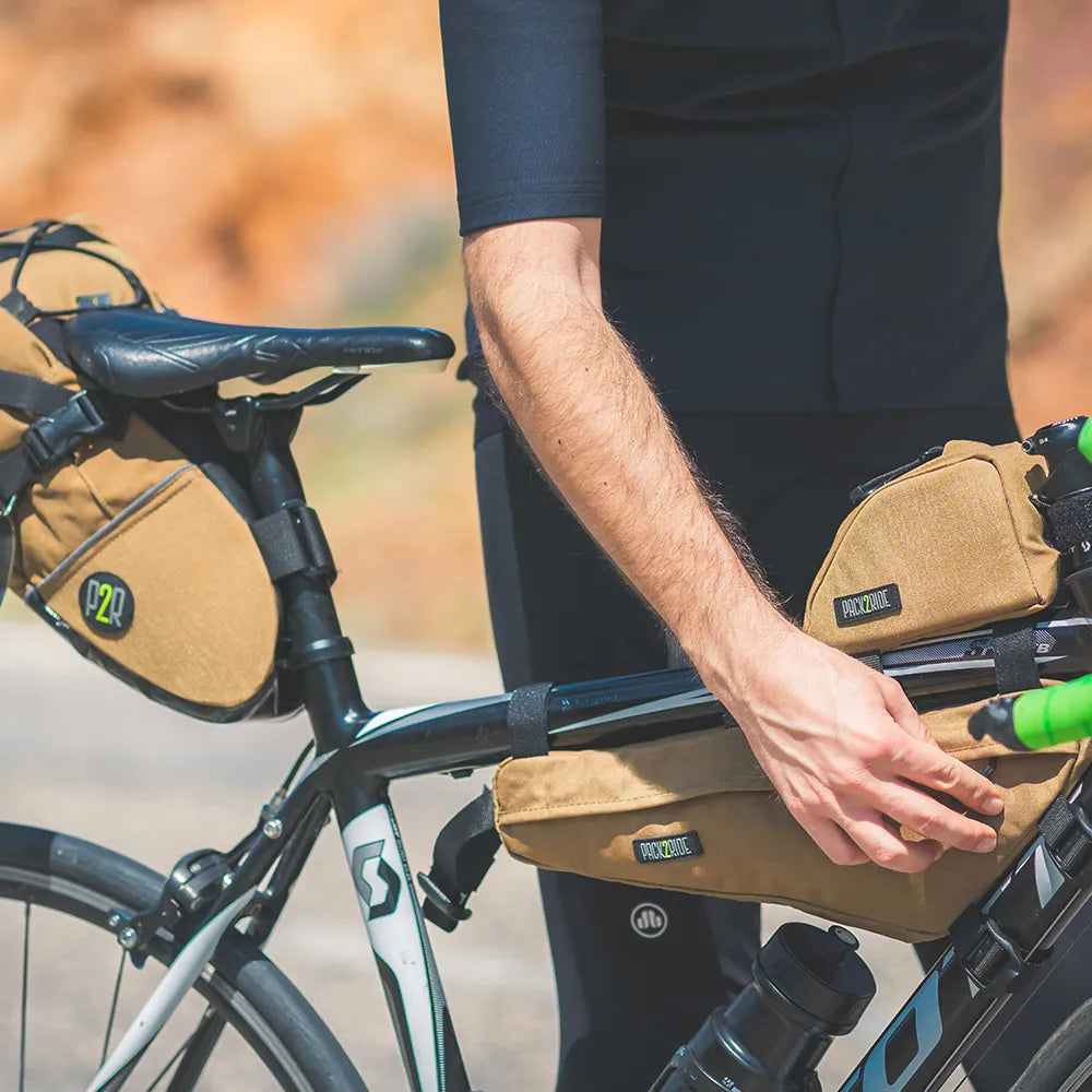 • Water Resistant. Produced with long-lasting YKK AquaGuard® zipper with water-repellent coating and Cordura® 1000D fabric which is resistant to water and harsh conditions. Enjoy your Pack2Ride frame bag for life.