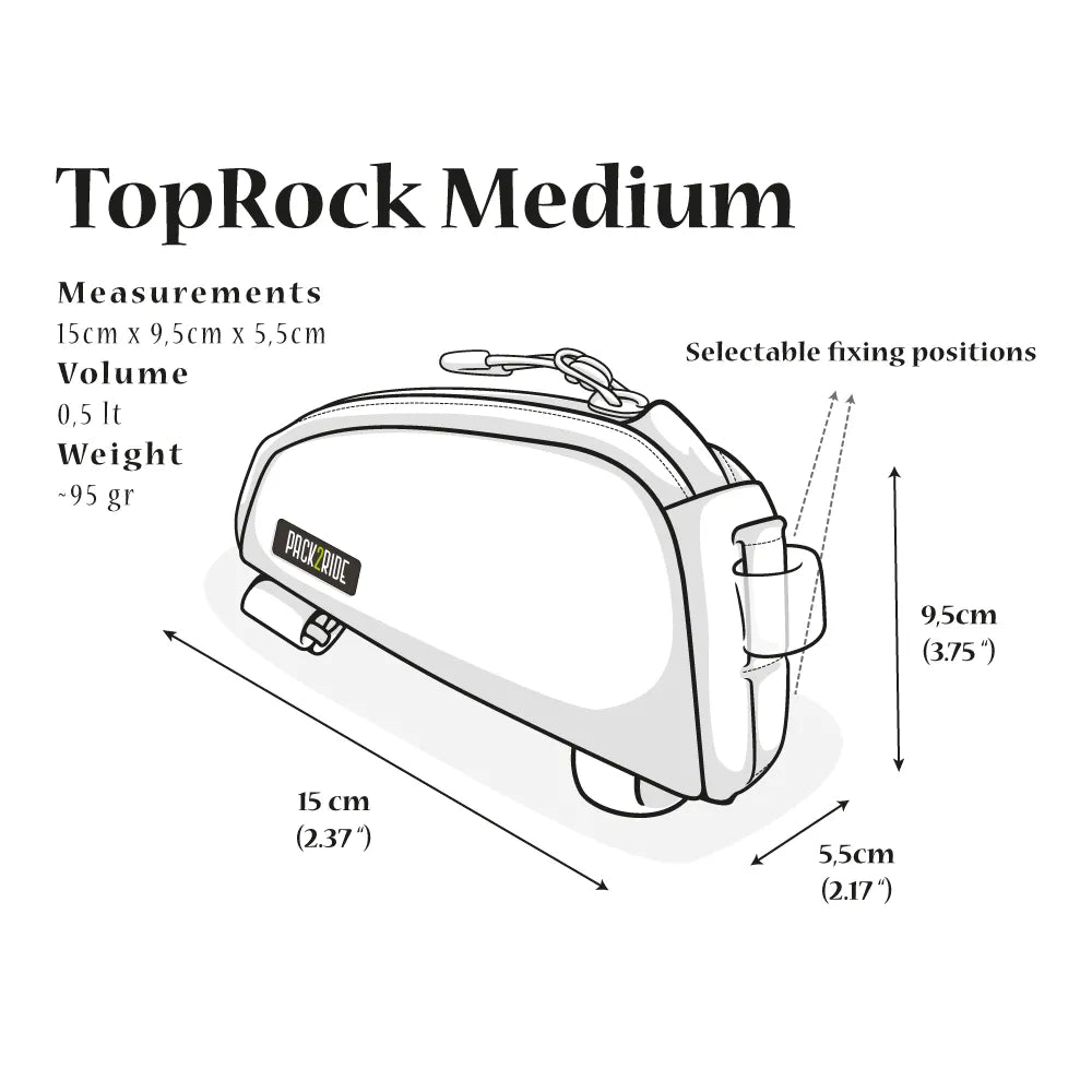 • Toprock M: 16cm x 9,5cm x 5,5cm dimesions and specially designed to fit perfectly for your bike. Padded on all surfaces, super lightweight (only 95 gr) top tube bag.