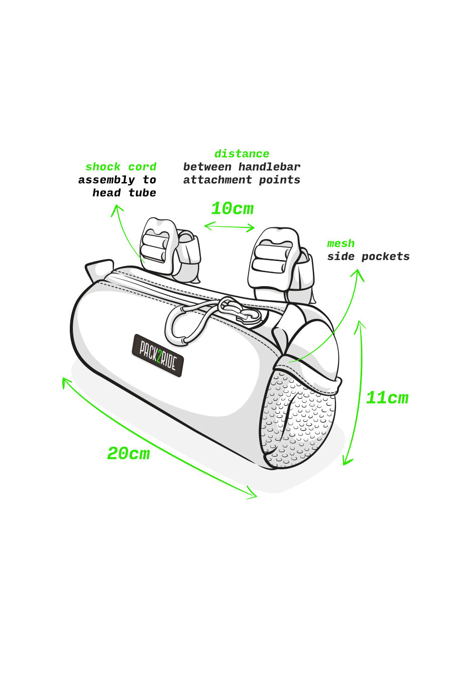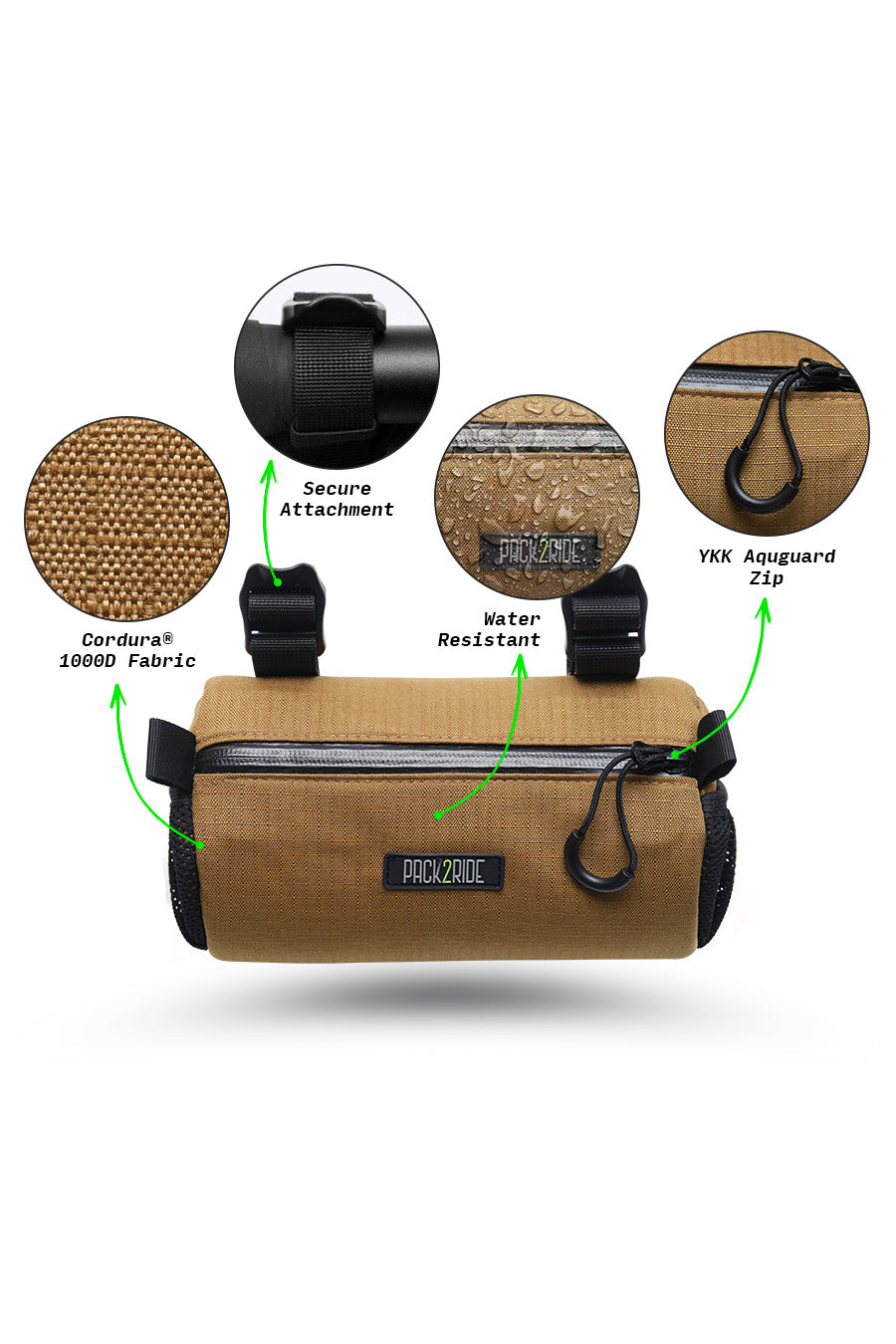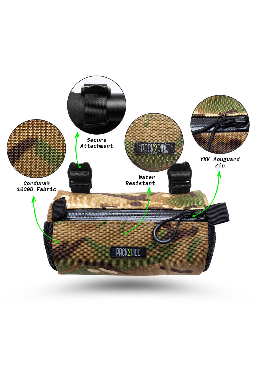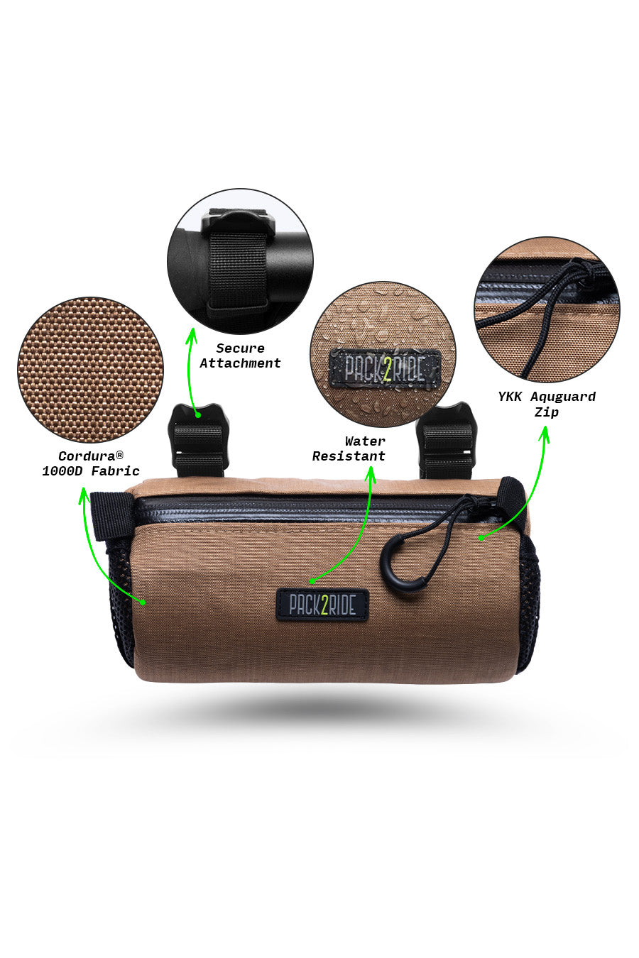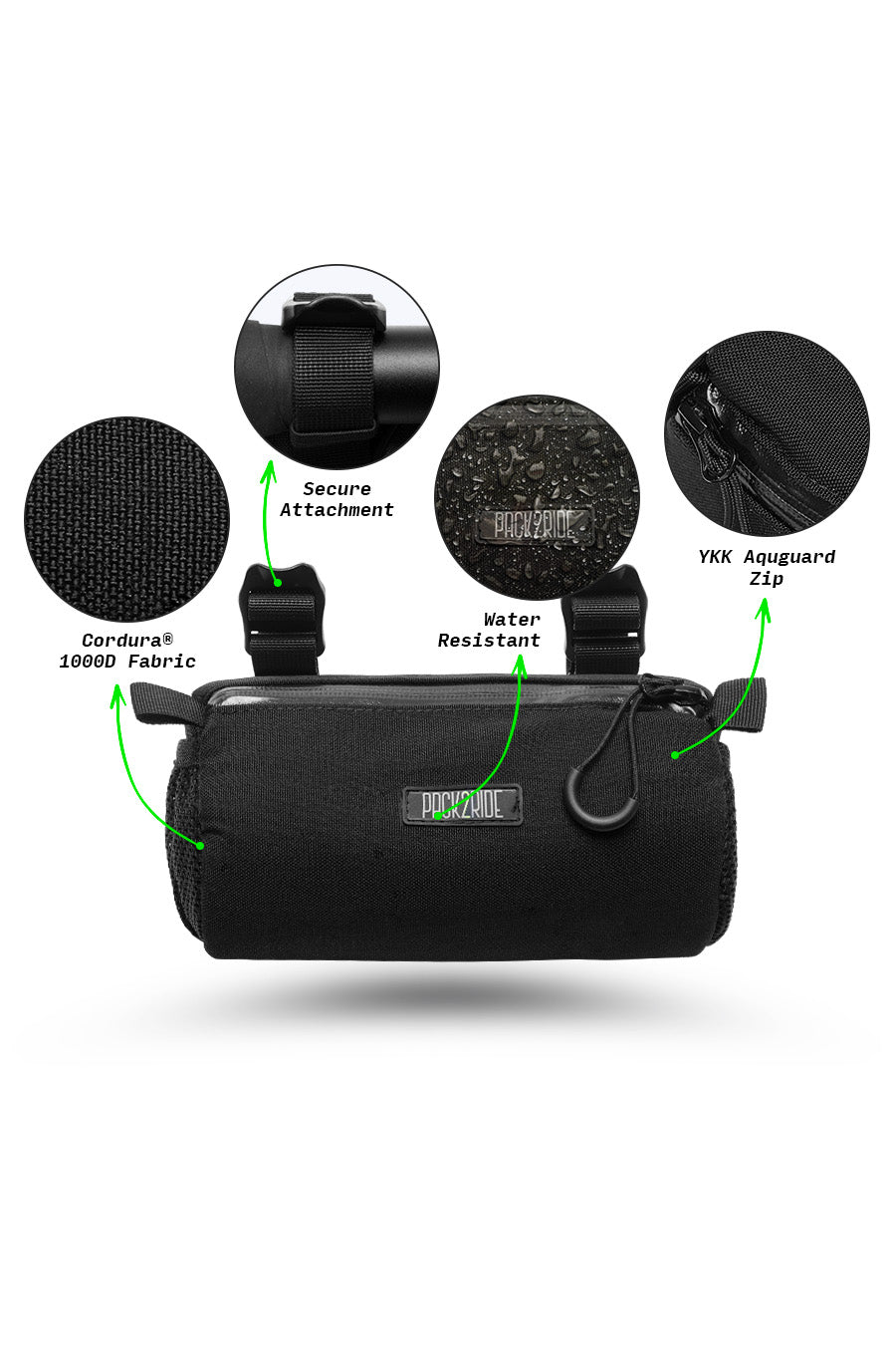 • Extremely water resistant. Strong against rain, mud and all kinds of harsh conditions with waterproof Cordura® 1000D fabric and YKK® Aquaguard water-repellent coated zippers. Enjoy your Pack2Ride handlebar bag for life.